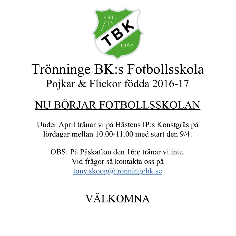 Nu drar fotbollsskolan igång. Lördagen den 9 april på Håstens konstgräs! 10:00-11:00 Barn födda 2016 och 2017 Även verksamheten för barn födda 2015 startar upp samtidigt, även den på Håstens konstgräs. Välkomna! Trönninge BK 6 apr 2022 0kommentarer