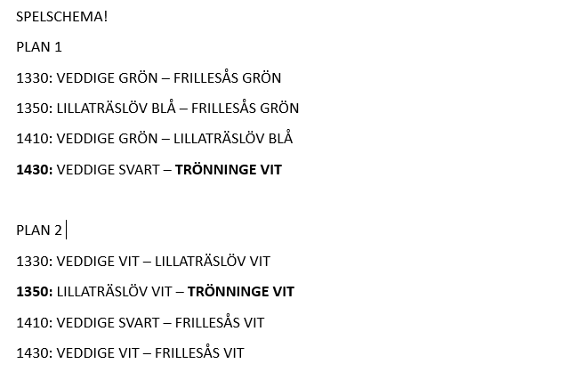 Här kommer laget som spelar i Veddige på lördag. Samling på Veddige IP kl 13:20. Trönnige Vit Sam Ekwall Julian Blom Leon Sjögren Zion Ignell Felipe Gunnesson Rauda Loui Karlsson Bra om killarna har svarta strumpor när de kommer till matcherna. Det finns att låna men de är stora i storleken. Matchtröja och shorts finns hos ledarna. Glöm inte vattenflaska. Ses på lördag! Mvh Ledarna