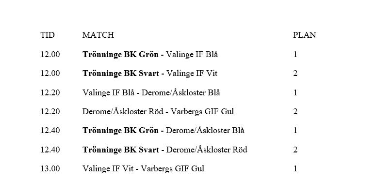 Här kommer lagen som ska spela hemma på Håsten på lördag. Samling 11:30. Trönninge BK Grön Filip Åkesson Arvid Bjerkendal Olle Levin Leon Haverstal Theodor Gustafsson Sigge Andersson Jamie Kniberg Trönninge BK Svart Alex Sonström Frank Levander Emir Melkic Milo Andreasson Casper Sriphuthorn Charlie Svensson Bra om killarna har svarta strumpor när de kommer till matcherna. Det finns att låna men de är stora i storleken. Matchtröja och shorts finns hos ledarna. Glöm inte vattenflaska. Ses på lördag! Mvh Ledarna