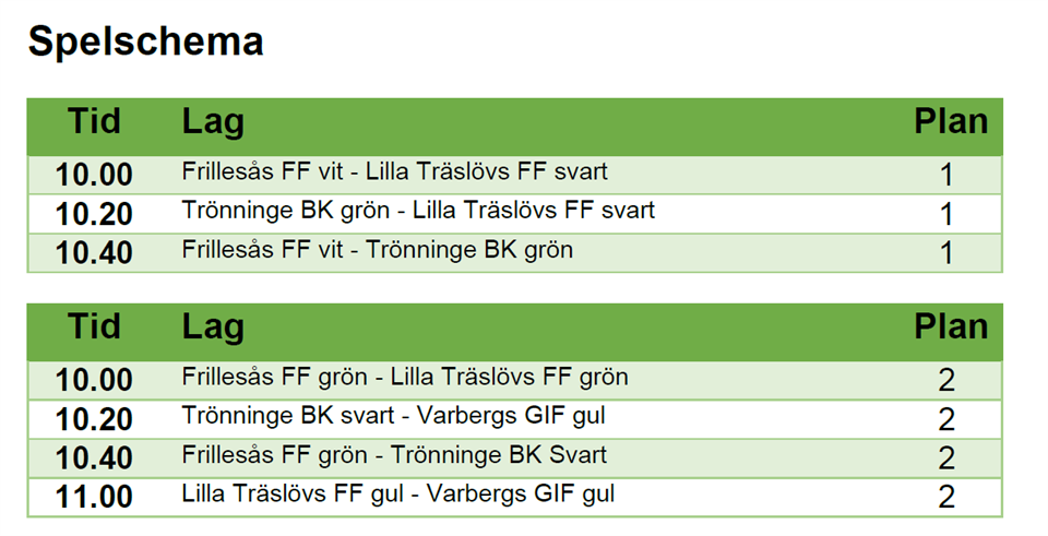 Här kommer laget som ska spela i Derome 3/9. Samling 12:30 på Dersbovallen i Derome. Trönninge BK vit Sam Ekwall Filip Åkesson Theodor Gustafsson Jamie Kniberg Harry Rosengren Noel Andersson Milo Andreasson Olle Levin Pool 3, plan 1 13:00 Derome/Åskloster röd - Träslövsläge IF vit 13:20 Träslövläge IF vit - Varberg Gif röd 13:40 Derome/Åskloster röd - Varberg Gif röd Pool 4, plan 2 13:00 Varbergs Gif blå - Trönninge BK vit 13:20 Derome/Åskloster blå - Träslövsläge IF blå 13:40 Träslövsläge IF blå – Trönninge BK vit 14:00 Derome/Åskloster blå – Varberg GIF blå Mvh Ledarna P10 - 2016 30 aug 2023 0kommentarer