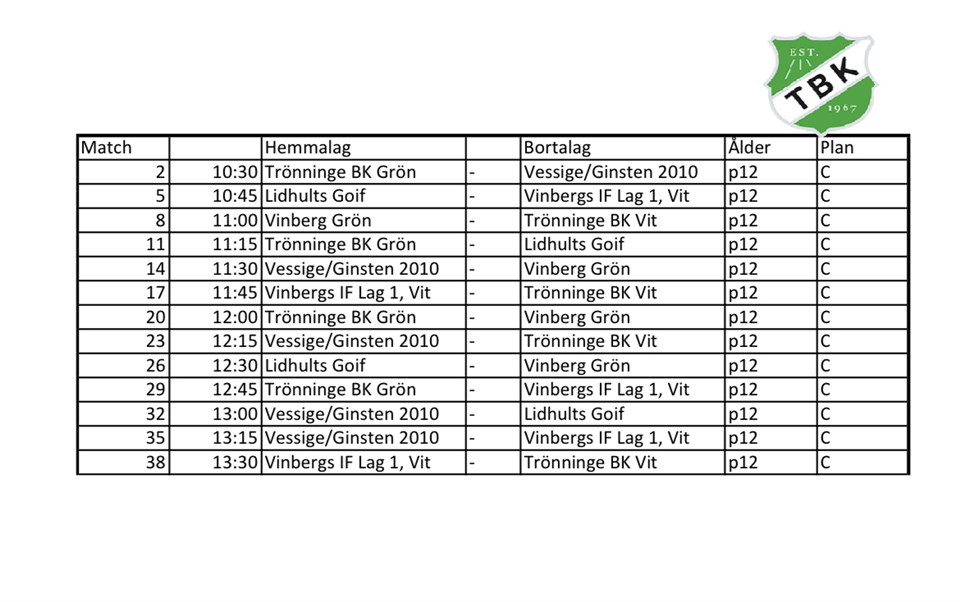Hej hej, Här kommer lagen och tider inför söndagens inomhuscup i Arena Varberg. Vi deltar denna gång med fyra (!) lag och det är olika samlingstider för de olika lagen. Spelschemat hittar man här. Ta på barnen svarta strumpor och svarta shorts. Ta med benskydd och vattenflaska. Matchtröja får man på plats. Är det någon som behöver skjuts, så ropa till så hjälps vi åt. Skulle man missat att anmäla sig så skriv nedan så placerar vi ut i mån av plats. Gröna laget Samling 12:45 på Arena Varberg. Första matchen är 13:15. - Axel Oscarson - Benn Schmidt - Leo Larsen - Liam Ekengren - Noah Bertilsson - Tage Bäckström Grön/vita laget Samling 12:45 på Arena Varberg. Första matchen är 13:15. - Colin Johansson - Liam Olsson - Seth Nilsson - Sigge Westerholm - Tim Nylin - Mahmoud Alkam Svarta laget Samling 13:00 på Arena Varberg. Första matchen är 13:30. - Axel Sundler - Enrique Gunnesson Rauda - Harry Nilsson - Theo Karlsson Ångström - John Ljungfalk Vita laget Samling 13:15 på Arena Varberg. Första matchen är 13:45. - Benjamin Lind - Bosse Widenberg - Gabriel Stenqvist - Olle Nylin - Viggo Blom P12 - 2014 1 dec 2022 13kommentarer