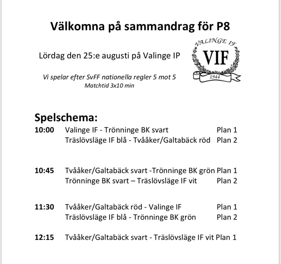 • Lag och tider till Valinge 25/8